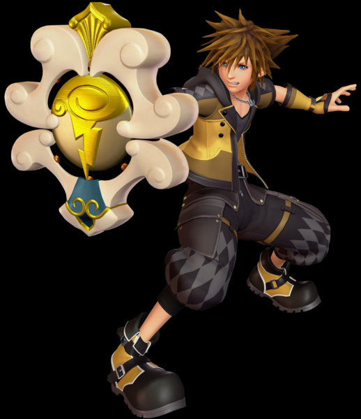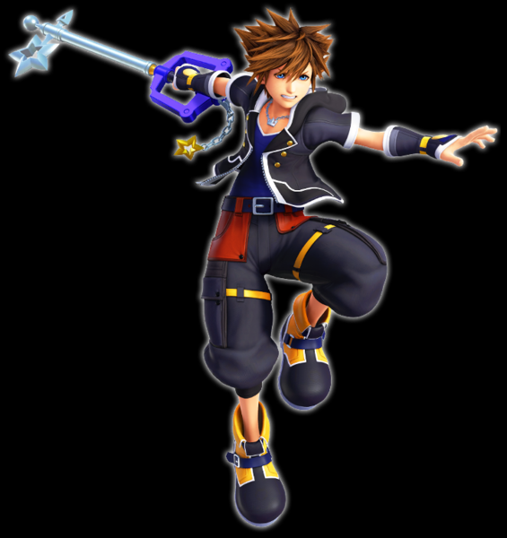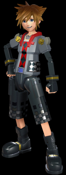 Sora is a teenage boy who has blue eyes and spiky brown hair that looks impossibly soft. He stands at a height of about 5'6" and has a lithe but muscular build after a couple of years training with the Keyblade fighting monsters. His clothes are mainly black, with hints of red and gray and big yellow and black shoes. There is usually a hood on his jacket, and his pants stop mid-thigh while containing many pockets. A silver crown necklace is always present around his neck, and he has a pair of "gloves" on (they're arm warmers in KH3).